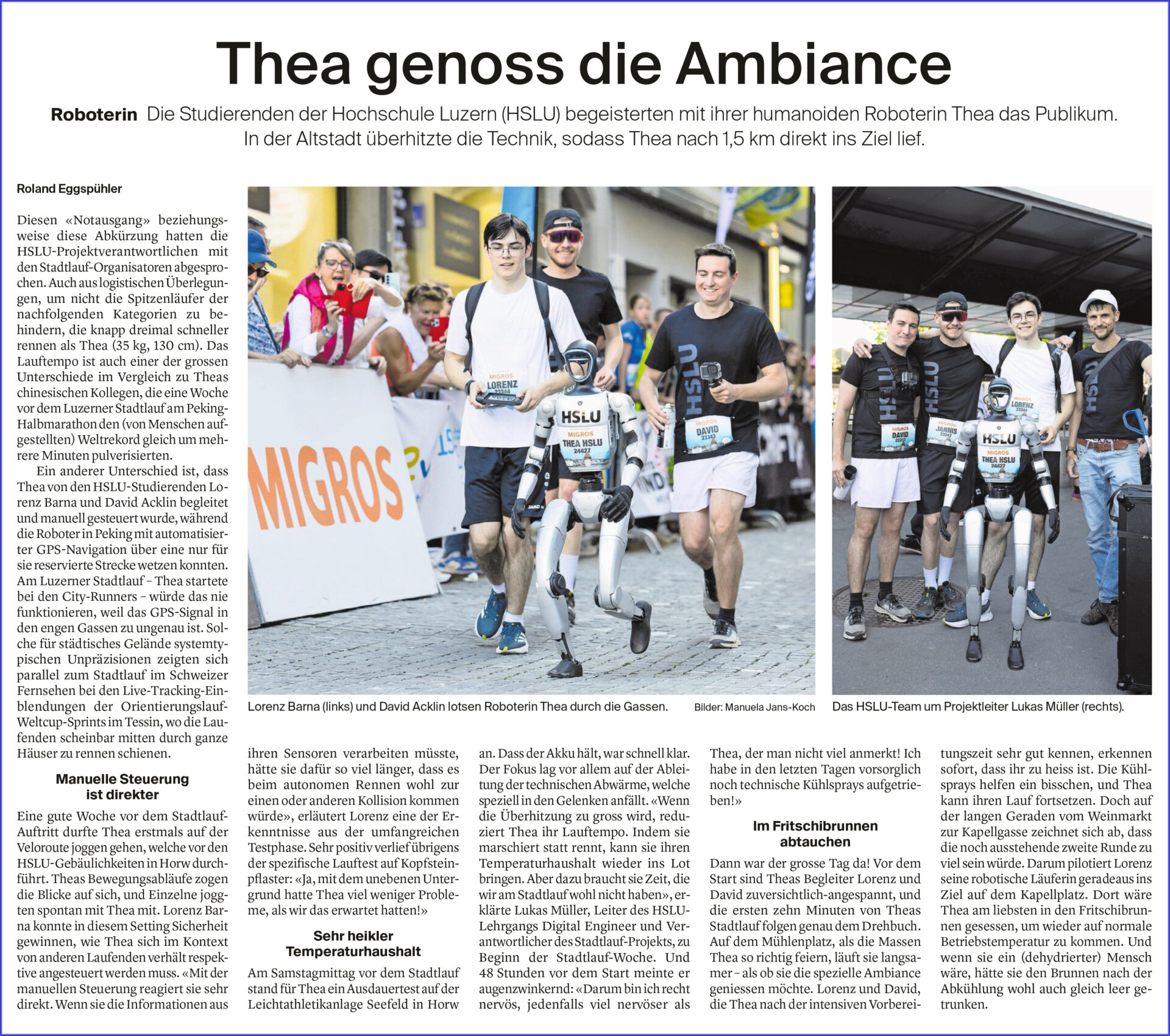 Thea ist eine humanoide Roboterin, sie nahm für die Hochschule Luzern (HSLU) am Luzerner Stadtlauf teil. Ihr Name ist leitet sich aus «T» und «A» ab, welche für das HSLU-Departement «Technik & Architektur» stehen. Unser Roland Eggspühler hatte die nicht alltägliche und ehrenvolle Aufgabe, Thea und das HSLU-Team durch dieses Projekt begleiten und für die Stadtlaufbeilage eine kleine Reportage verfassen zu dürfen.