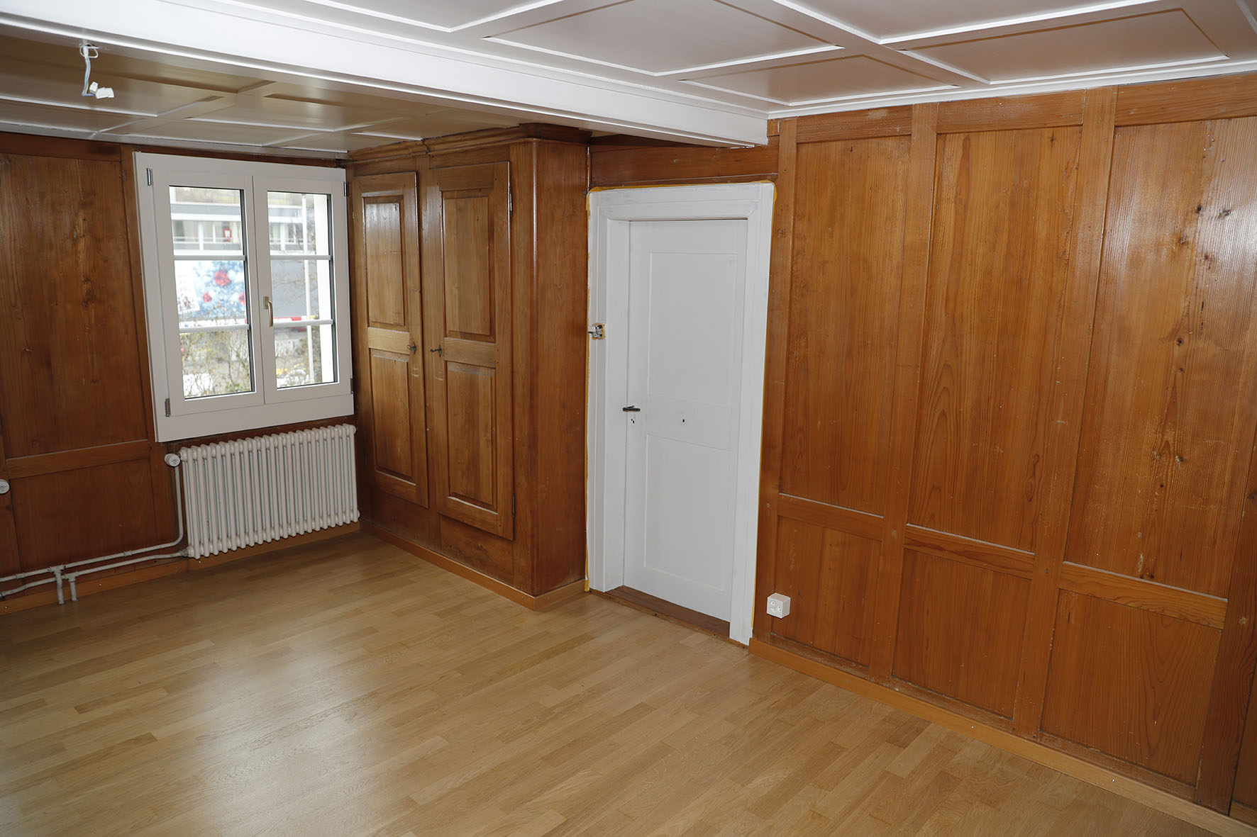 Der Anbau enthält das allgemeine Treppenhaus und Wasch-/Trockenräume (im Sockelbereich). Pro Etage ist im Anbauvolumen ein zusätzliches Zimmer und auf der Stirnseite eine Loggia. Zusammen mit den drei Altbau-Zimmern (pro Etage) ergeben sich zwei aussergewöhnliche 4-Zimmer-Wohnungen und eine 3½-Zimmer-Dachwohnung, die im Spannungsfeld von Alt und Neu oder von klassischem Holztäfer und moderner Raumgestaltung stehen. Sehr speziell ist die Dachwohnung, in welcher die alten Dachkonstruktionsbalken freigelegt und ins Raumkonzept integriert sind.